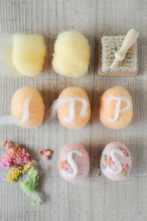 羊毛たまごをつくり、アルファベットを羊毛刺繍しました。