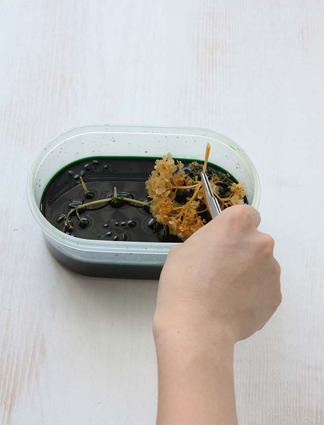 生のお花を加工液に浸すだけなので、意外に簡単。