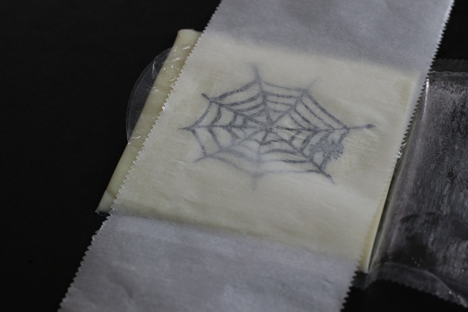 絵が描きあがったら、チーズにのせ、クッキングシートなどで押さえながらピッタリと貼り付けます。絵の具がついたり、ちょっとよれたりした部分は絵の外側であればあとからハサミで取り除けるので問題ありません!