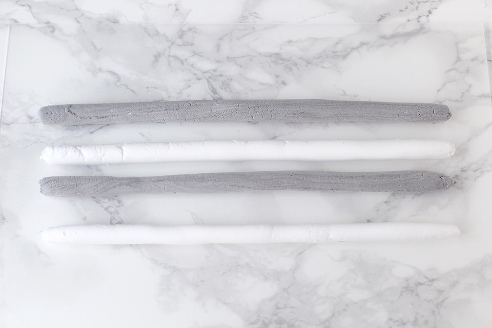 棒状に伸ばした紙ねんどを半分に折り返し、ねじります。