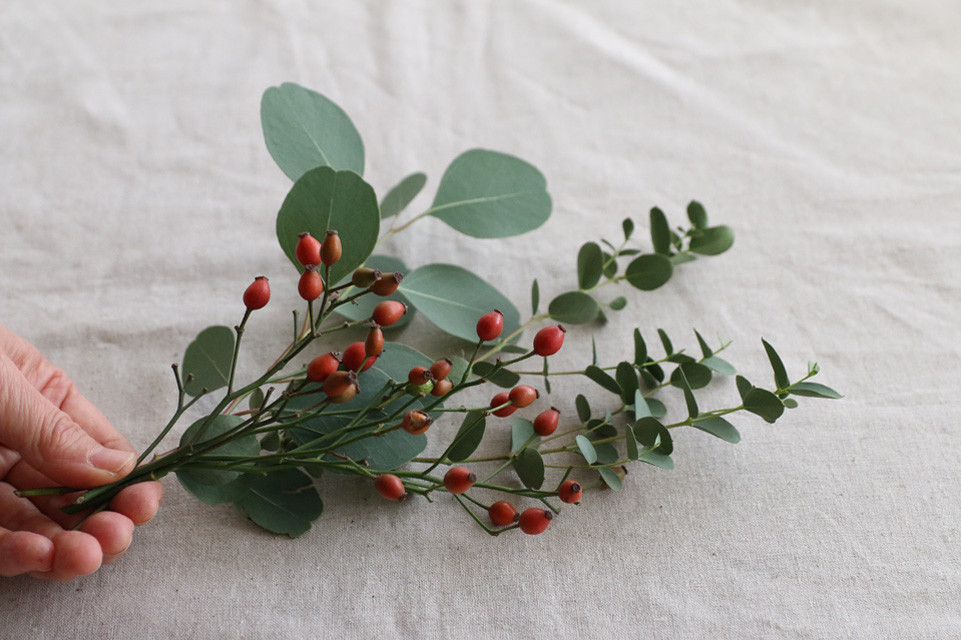 使用した野花は、左からグニーユーカリ、ユーカリ・ポポラス、松ぼっくり、ノバラの実です。