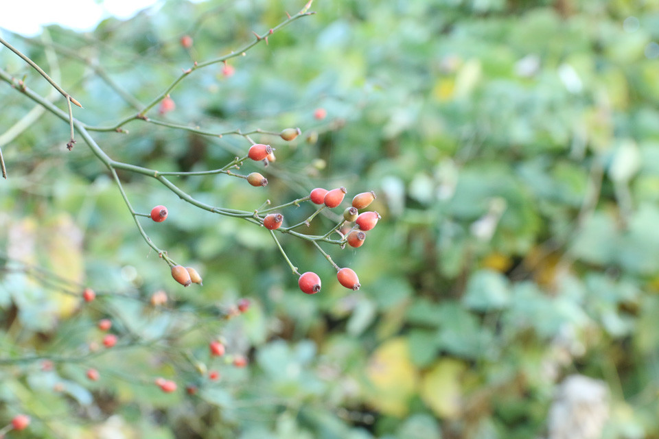 野花探しは家の周りだけでなく、車で出かけて探すことも多い私。バラの実がある場所を見つけたのは2年前。野花アンテナがピピピ! と反応して車で進むと赤い実が♪