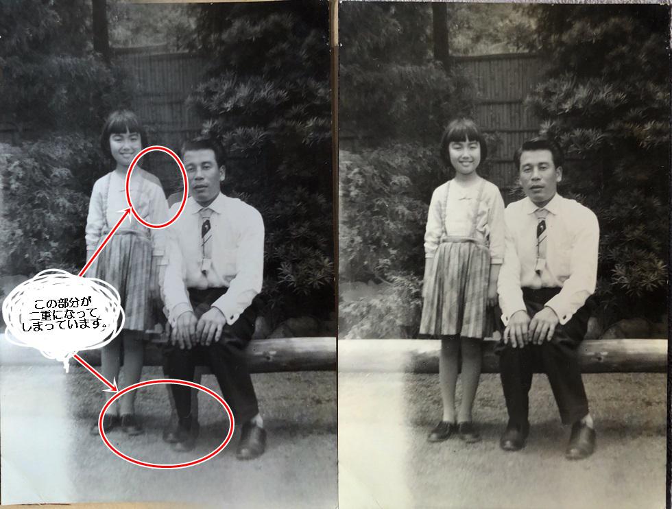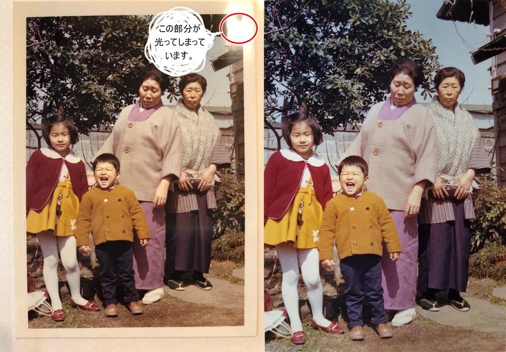 左がiPhone撮影のもので、右がシートの上から「Omoidori」を使用し撮影したもの。シートのテカリもなくスキャンでき、色あせてしまった写真も補正され色がよみがえりました。