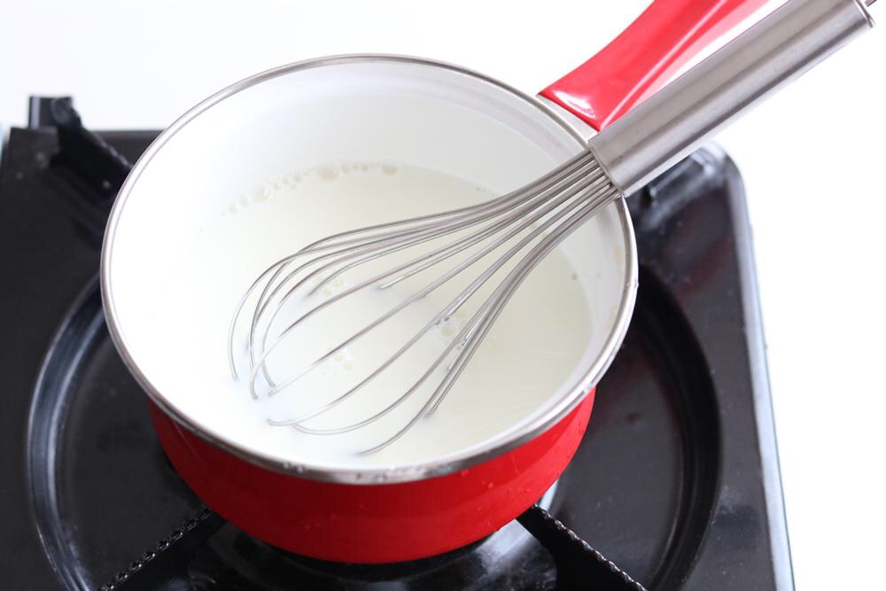 ① お鍋に牛乳200ccと砂糖を入れ、砂糖が溶けるまで温めます。