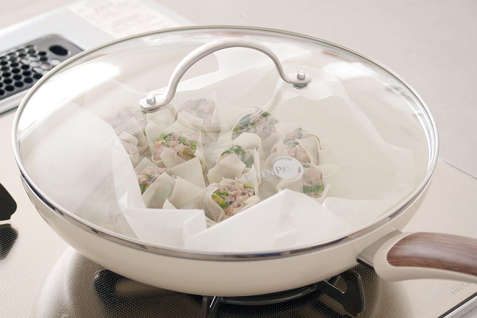 焼売を作りたいけれども、蒸し器がなくて…という方でも、フライパンとクッキングシートがあれば大丈夫ですよ。