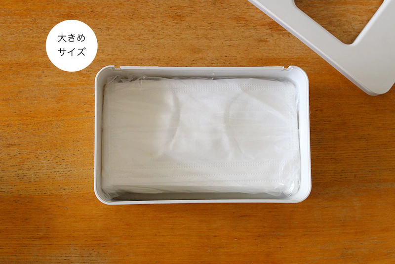 大きめサイズは少し窮屈ですが、無印のケースが18.6cmで、マスクが17.5cmなのでサイズ的には大丈夫そうです。