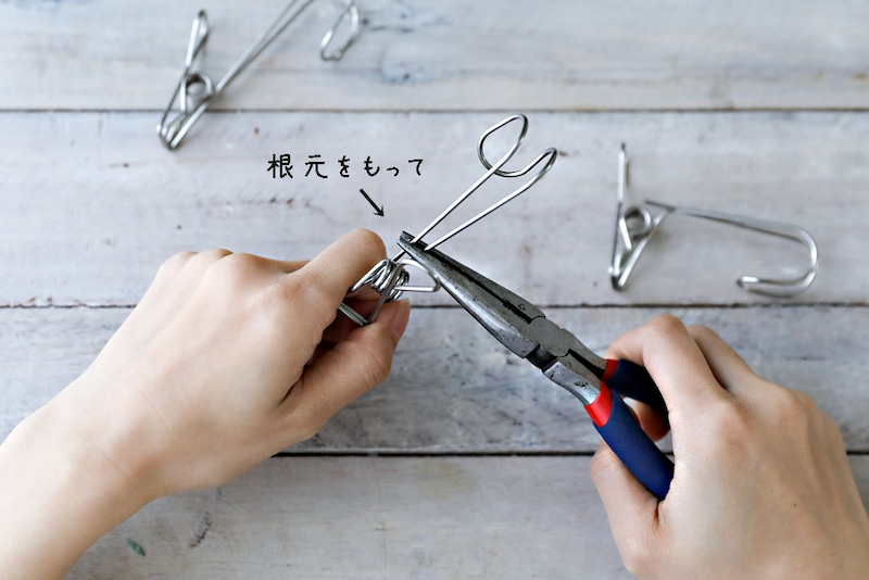 クリップの長い柄の部分ををペンチで90度に曲げます。