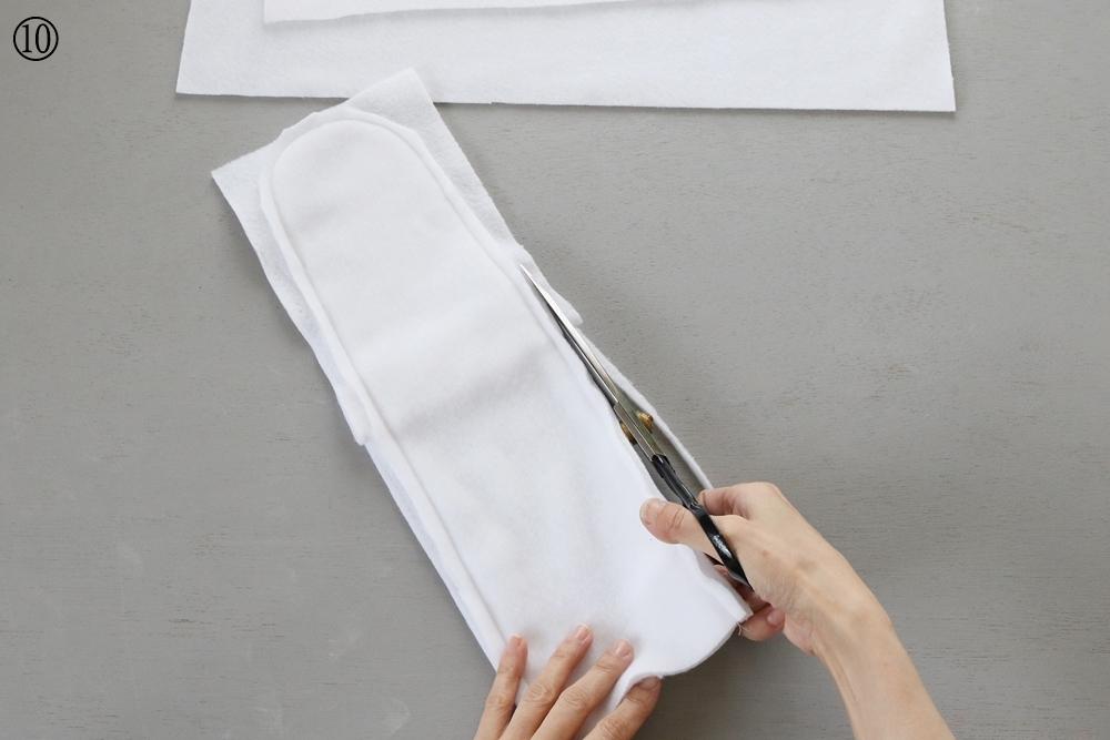 最初にカットした甲側の生地のサイズに合わせて縫い代をカットしたら、ひっくり返して完成です。