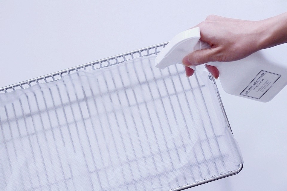 水切りカゴにキッチンペーパーを敷いてホワイトビネガーをスプレーします。