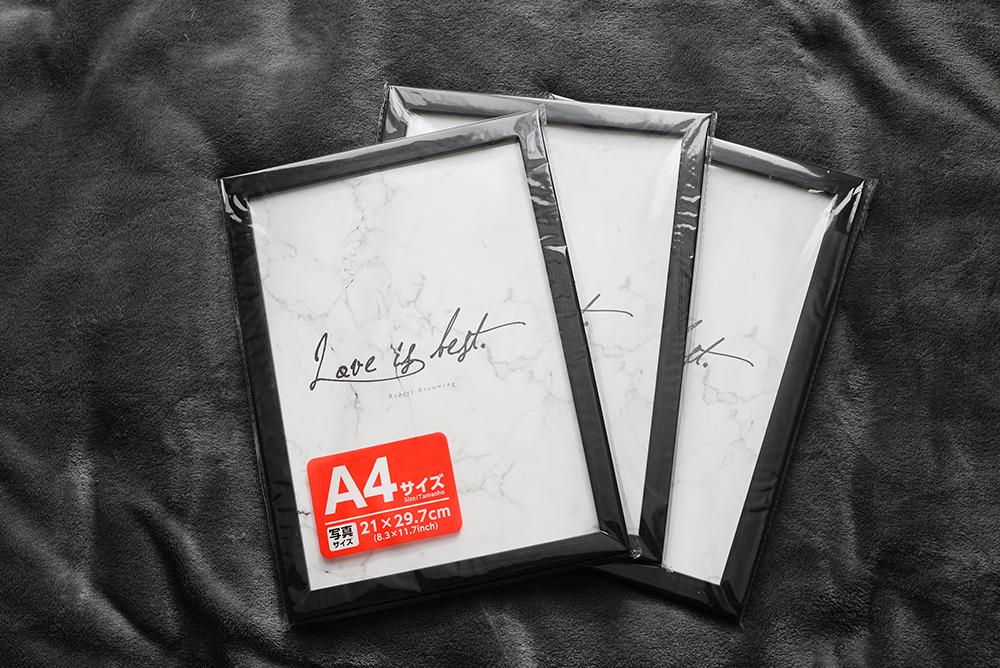 部屋の広さに合わせて、私はA4サイズくらいがちょうど良いかなと思い、100円ショップで3つ、黒のフレームを買ってきました。
