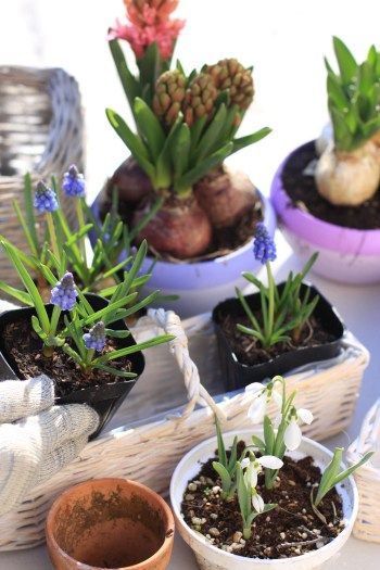 お花屋さんや、ガーデニングショップにある鉢植えのちょっと芽が出てきた球根植物をバラバラにしてガラスの器やバスケットに寄せ植えにします。