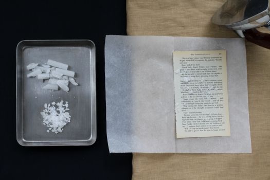 カッターなどで細かくしたろうそくを紙の上にまぶします。