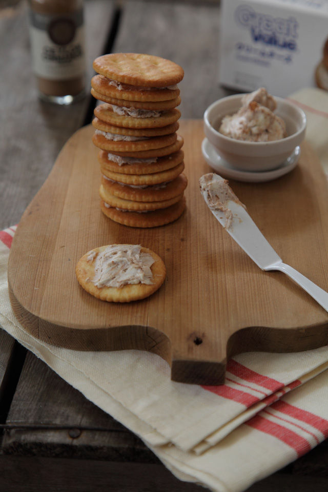 クリームチーズとシナモンパウダーを混ぜたものをクラッカーなどにつけていただきます。