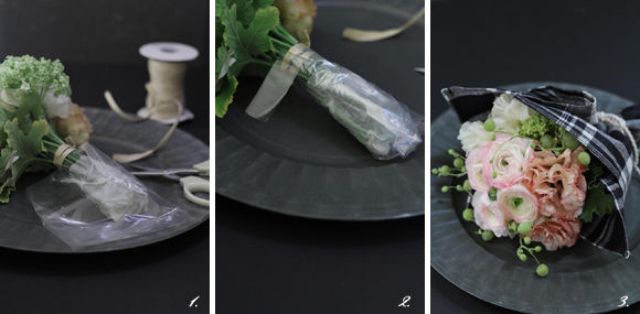 - 花束をキッチンクロスでふわりと包み、リボンや紐で根元を結びます。