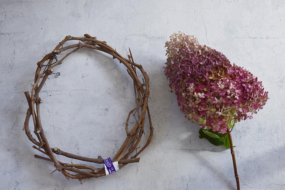 今回は道の駅で購入したミナヅキで作りましたが、フライングリースの作り方はドライフラワーに向いている花材や、100円ショップで売っている紫陽花の造花を代用して作ることができます。