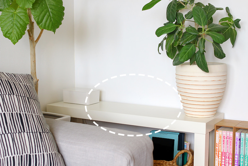 ソファー横の小さな台はipadやスマホ、娘のタブレット、GPSの充電などするスペースです。
