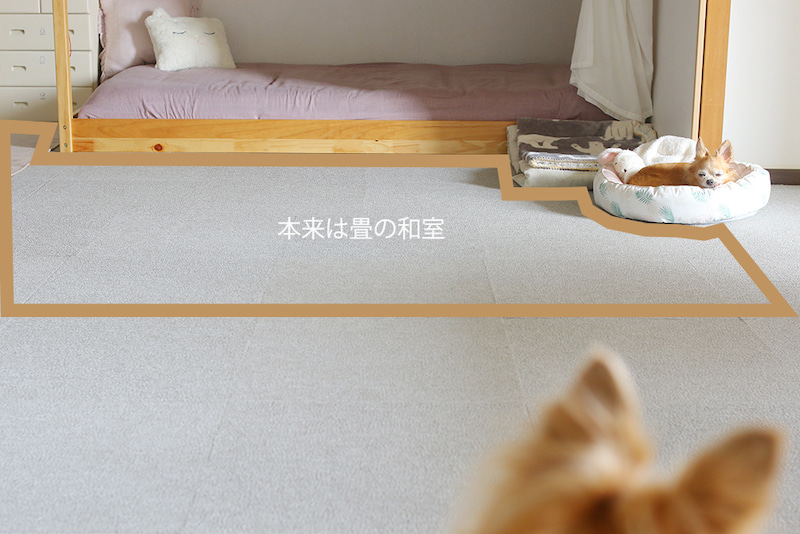 部屋が仕切れるように襖があるのですが、襖をしめることはないので畳みにもタイルカーペットを全面に