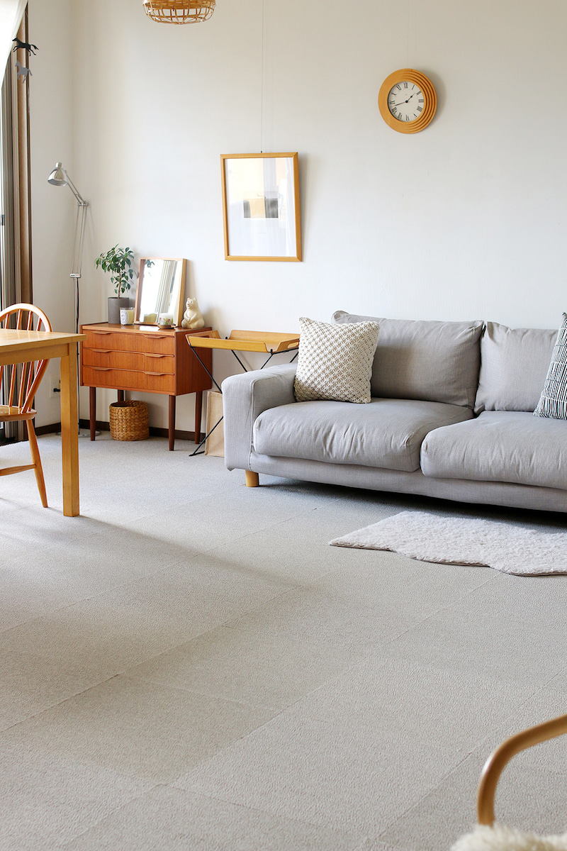 もともとの濃い茶色のフローリングは重たい感じがしていたので、タイルカーペットの淡いグレーで広く感じるようになりました。