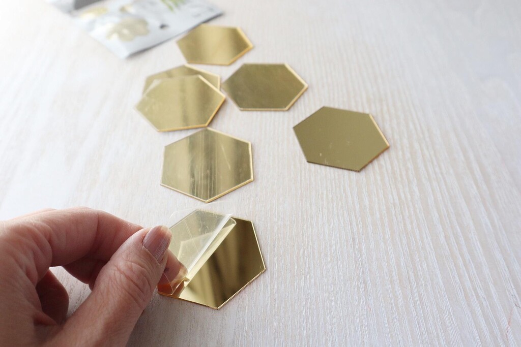 セリアのDIYコーナーで見つけた、5センチほどの六角形のミラー風タイル。