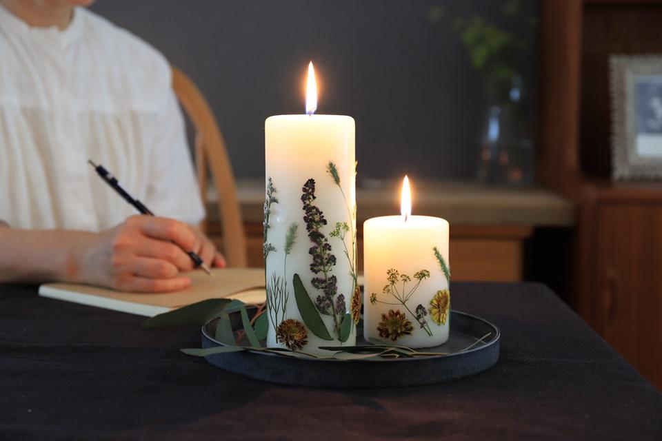 今回ご紹介するのは、既成の白い円柱状のキャンドルに押し花を飾ったボタニカルキャンドルの作り方。